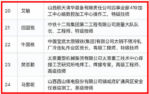 他們分別是:山西航天清華裝備有限責(zé)任公司四事業(yè)部419加工中心組數(shù)控加工中心操作工,特級技師艾敏;中鐵十二局集團第二工程有限公司測量大隊隊長,工程師、特級技師田國銳;中國寶武太原鋼鐵(集團)有限公司太鋼不銹冷軋廠冷連軋作業(yè)區(qū)班長,高級工程師、特級技師牛國棟;太原重型機械集團有限公司太原重工技術(shù)中心焊接工藝研究所電焊工、焊接專家,高級工程師、高級技師樊志勤;山西西山煤電股份有限公司鎮(zhèn)城底礦通風(fēng)區(qū)安全儀器監(jiān)測工,高級技師馬黎明。