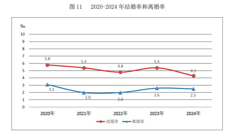 《公報》數據顯示,2024年,全國婚姻登記機構和場所共計4190個,其中婚姻登記機構1134個,全年依法辦理結婚登記610.6萬對,比上年下降20.5%。結婚率為4.3‰,比上年下降1.1個千分點。依法辦理離婚手續351.3萬對,其中:民政部門登記離婚262.2萬對,法院判決、調解離婚89.1萬對。離婚率為2.5‰。