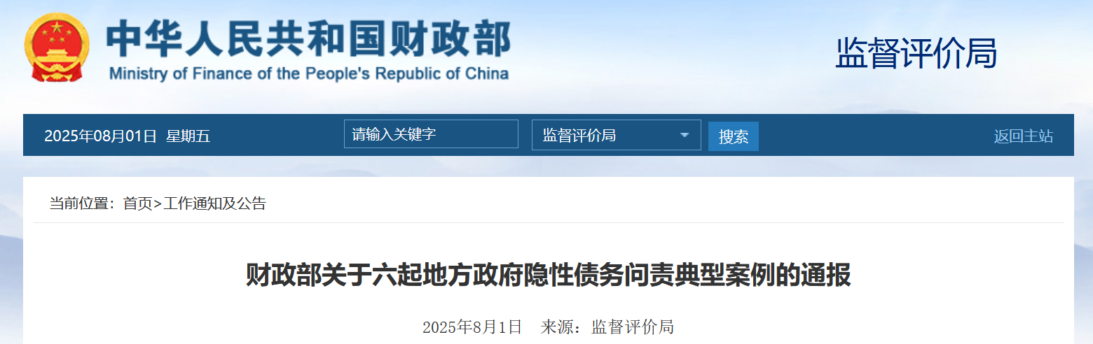 8月1日,財政部監督評價局就六起地方政府隱性債務問責典型案例發布通報: