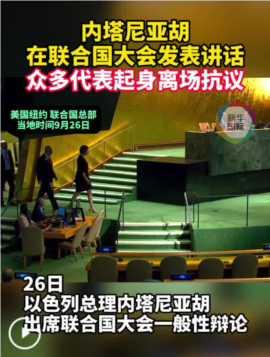 當(dāng)日,以色列總理內(nèi)塔尼亞胡在第80屆聯(lián)合國(guó)大會(huì)一般性辯論發(fā)言。眾多聯(lián)合國(guó)會(huì)員國(guó)代表起身離席,退場(chǎng)抗議。新華社記者吳曉凌攝