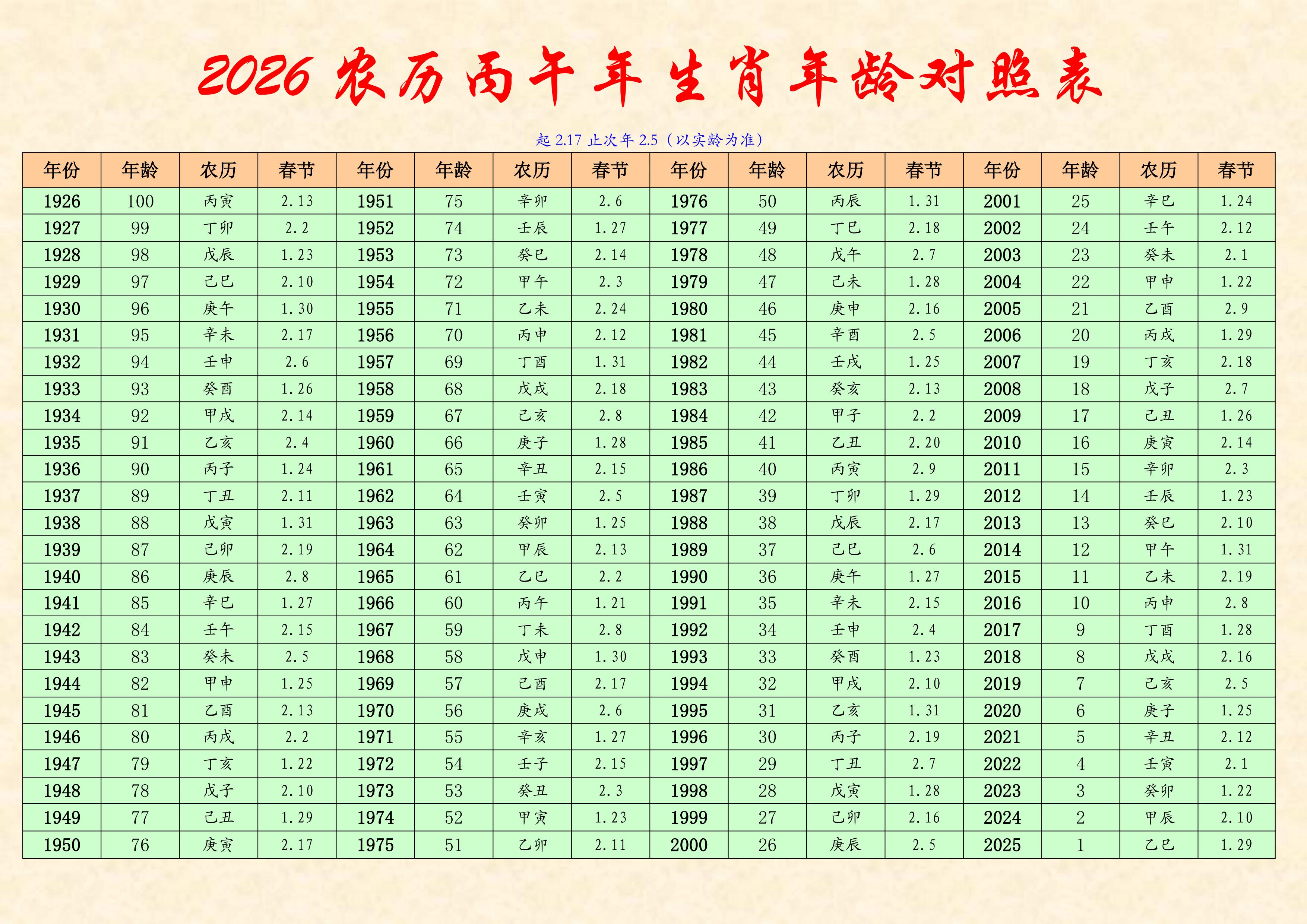 2026年農歷丙午年生肖年齡對照表