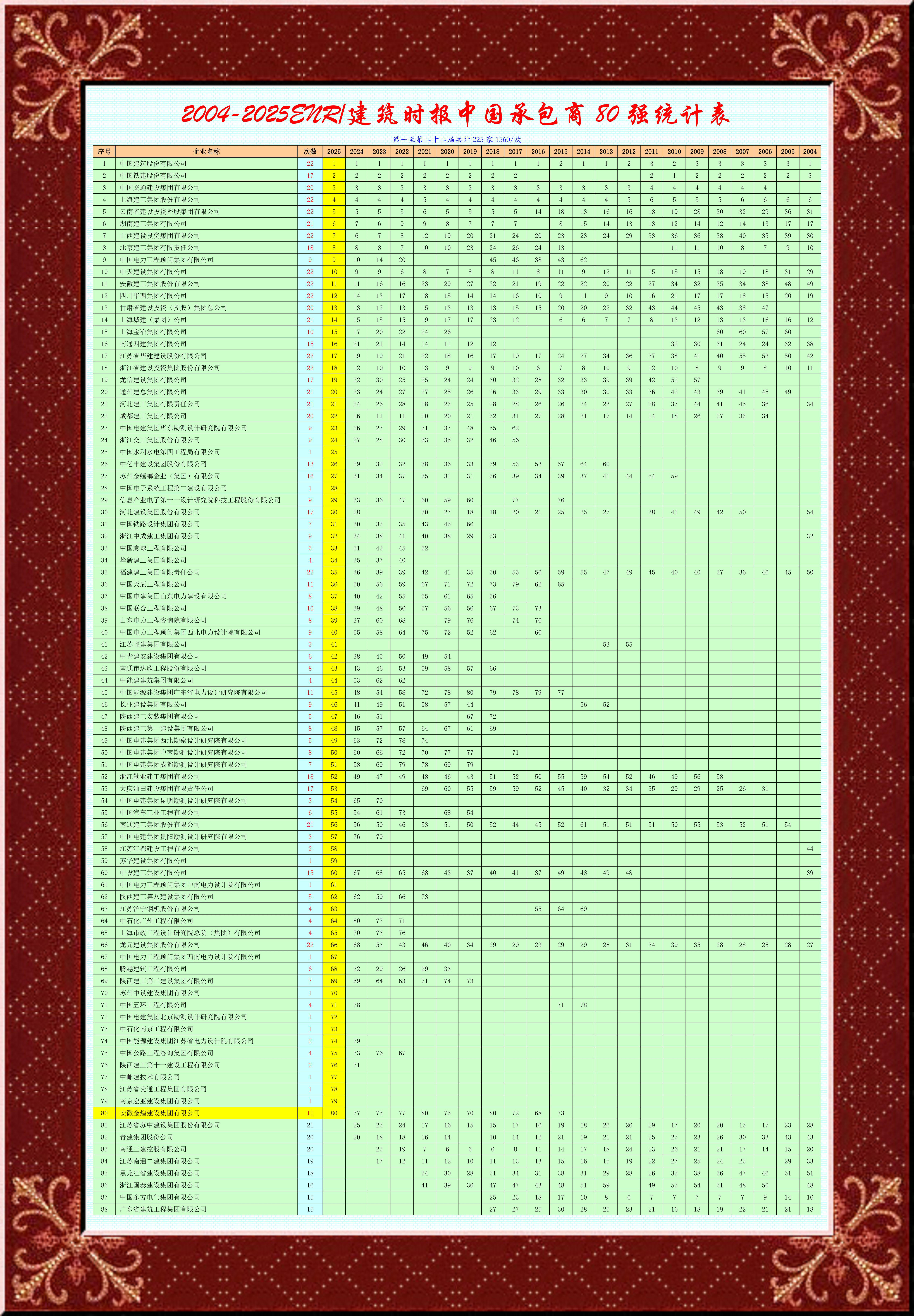 9月26日,美國《工程新聞記錄》(ENR)和中國《建筑時報》共同發布2025年度“中國承包商80強和工程設計企業60強”排名。中國建筑股份有限公司等80家承包商、中國電力工程顧問集團有限公司等60家工程設計企業入圍新一年度榜單。